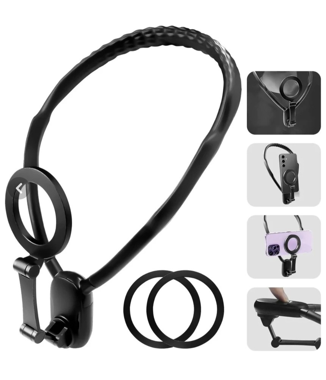 این نگهدارنده موبایل یک طراحی انعطاف پذیر، باکیفیت و با دوام دارد و می تواند به گونه ای تنظیم شود تا به صورت ایمن و مطمئن در اطراف گردن شما قرار گیرد. چسپندگی محکم آن تضمین می کند که تلفن شما در جای خود باقی می ماند و به شما این امکان را می دهد که بدون نگرانی آزادانه حرکت کنید و از آن برای تولید محتوا، تیراندازی و یا سایر کارهای در حال حرکت استفاده کنید. این هولدر گردنی با طیف گسترده ای از دستگاه ها از جمله آی فون، سامسونگ کهکشان، Huawei، LG و ... سازگار می باشد و همراه آن حلقه فلزی وجود دارد تا بتوان از آن برای تمامی مدل های تلفن همراه استفاده کرد. این هولدر مغناطیسی به شما اجازه می دهد تا به راحتی زاویه دید را تغییر دهید، این موضوع برای سازندگان محتوا که نیاز به انعطاف پذیری در ضبط از زوایای مختلف دارند، بسیار مناسب و کاربردی است. با فشار دکمه اتصال، شما به راحتی می توانید نگهدارنده را به گردن خود وصل و یا جدا کنید، این ویژگی در طول استفاده روزمره بسیار کاربردی می باشد. برای امنیت بیشتر در طول فعالیت های فیزیکی سبک، یک بند داخل جعبه گذاشته شده است که باید آن را وصل کنید تا هیچ نگرانی بابت افتادن موبایل نداشته باشید. استفاده از این هولدر گردنی برای ورزشهای با شدت بالا مانند پرش قوی (در حال دویدن سریع و غیره) توصیه نمی شود. برای تولید محتوا، ورزش های سبک، فعالیت های روزمره و ... توصیه می شود.